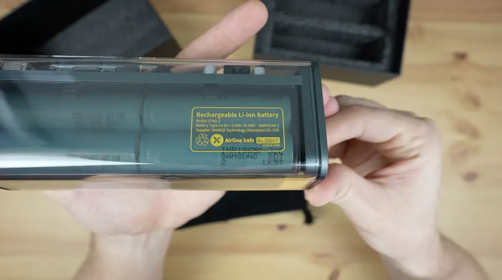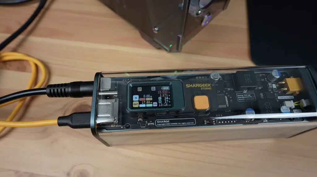 The Storm 2 has a 25,600mAh battery or more appropriately 93.5Wh, made up of 8 lithium-ion cells. So we could power this portable setup including the monitor for around 9 hours. Shargeek chose 93.5Wh as most airlines have a limit of 100Wh for power banks or portable batteries, so it is a high-capacity power bank but you can still travel with it.