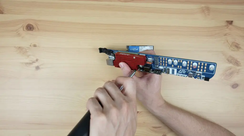 For the boot drive, I’m using a 1TB NVMe drive which I’ve preloaded with Raspberry Pi OS Lite. I pre-configured the operating system to enable SSH and I added myself as a user. You can also boot from a microSD card plugged into the slot on the blade if you don’t want to use an NVMe drive, or if you want to use the NVMe drive as a storage drive only, but I prefer the reliability of using it as the boot drive.