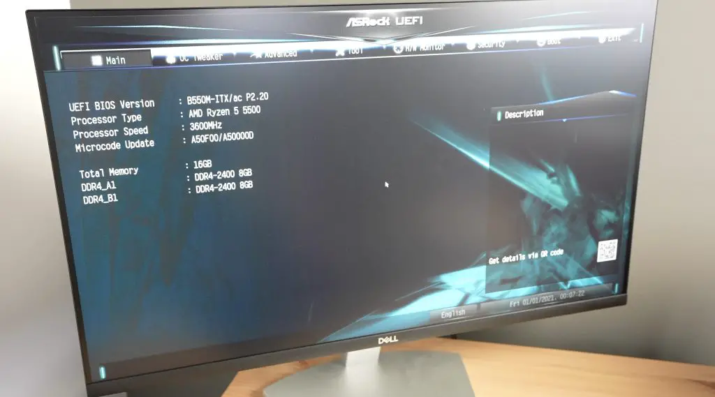 Now we need to set up the BIOS and install windows. I’ll do that with the computer running off the Explorer 2000 as well. In the BIOS, we can see we’ve got our Ryzen 5 processor detected as well as our two 8GB sticks of RAM and we can see our 1TB SSD.
