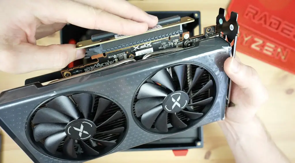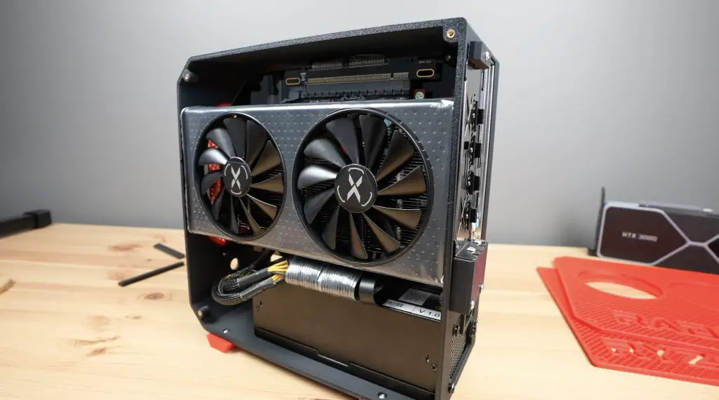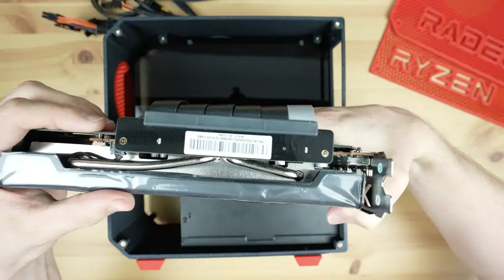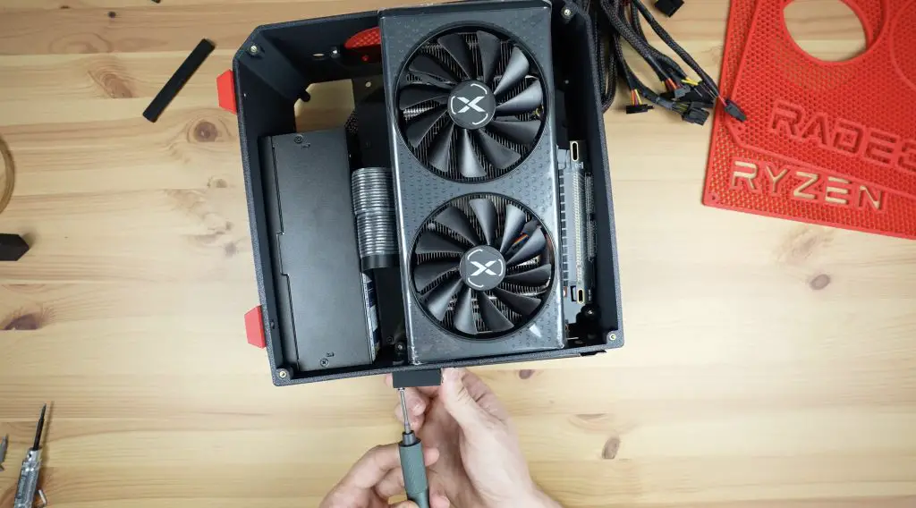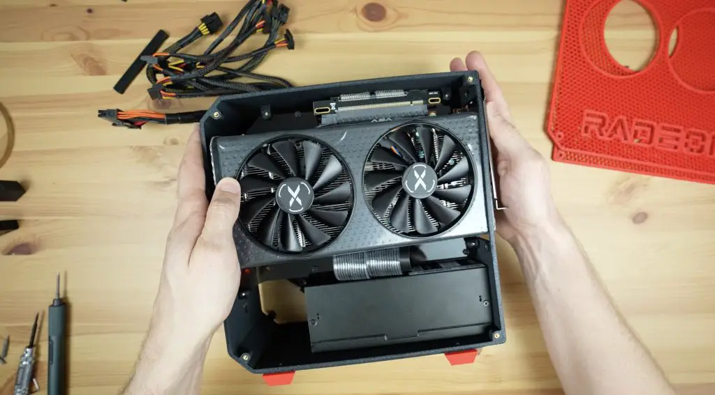 With the motherboard and power supply in place, the graphics card gets mounted on the opposite side.