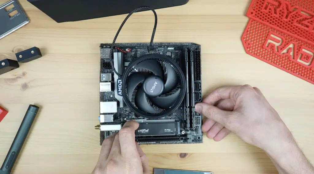 Then we can add our RAM to the two RAM slots, and add our SSD.