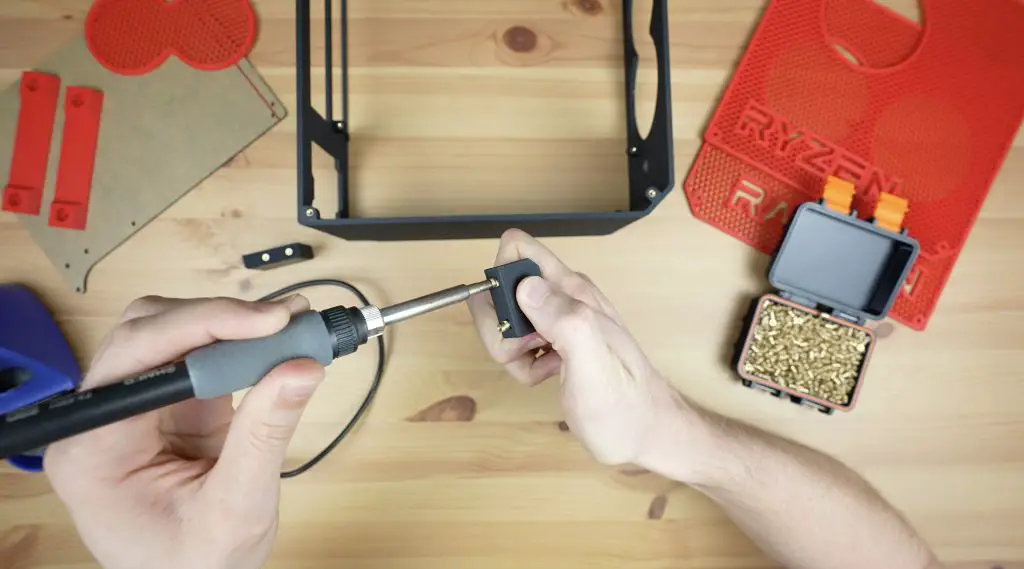 To complete the case components, we need to add a couple of M3 brass inserts into the main body of the case. To melt these into place I’m using a soldering iron with a brass insert tip and this too is running off the Explorer 2000.