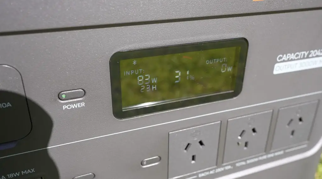 I’ve got the panel hooked up to the Explorer 2000 Plus and it’s set up outside in full sun to charge. In the morning sun it’s outputting around 60-70W, by midday it was outputting around 83W. Even at 83W, it’s still going to be a while but that’s an improvement on the morning results and it’s essentially free energy.