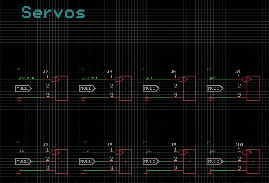 Firstly, I needed to add the 8 3-pin headers for servo plugs. The 3 pins of the header are the VCC (5V), GND and SIG (PWM signal). The VCC pins will be connected directly to the second power chip and the SIG pins will be connected to D2-D9 of ATmega328P.