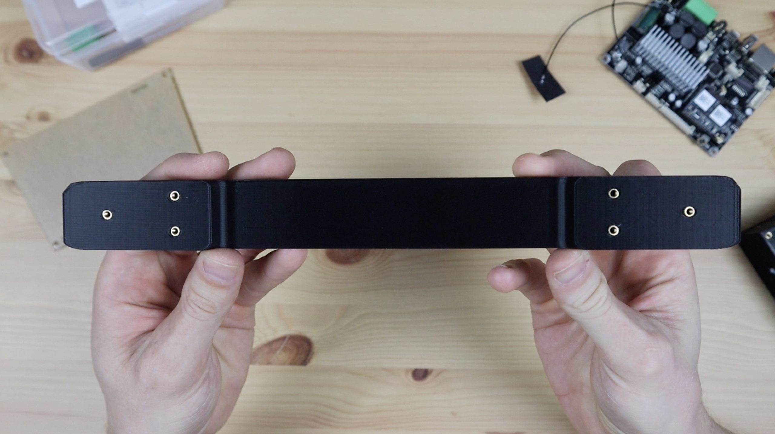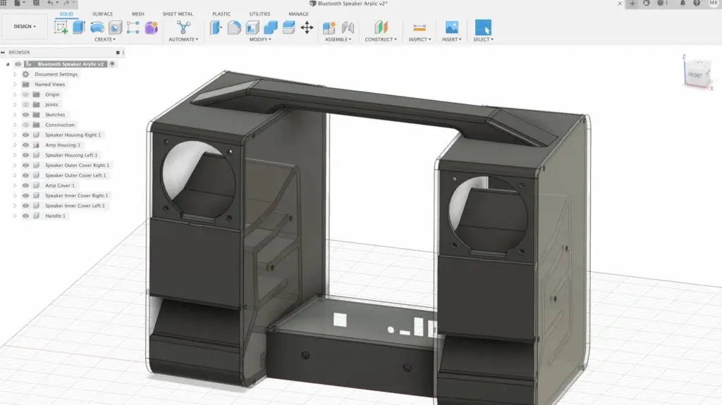 To start off, we need to re-design the amplifier housing to hold the Arylic Up2Stream Amp between the two speakers. Because this amplifier is a bit wider, we’re also going to have to adjust the speaker handle to span a bit further, but we’ll pick up on the same screw holes so that we can use the speaker housings with either amplifier board.