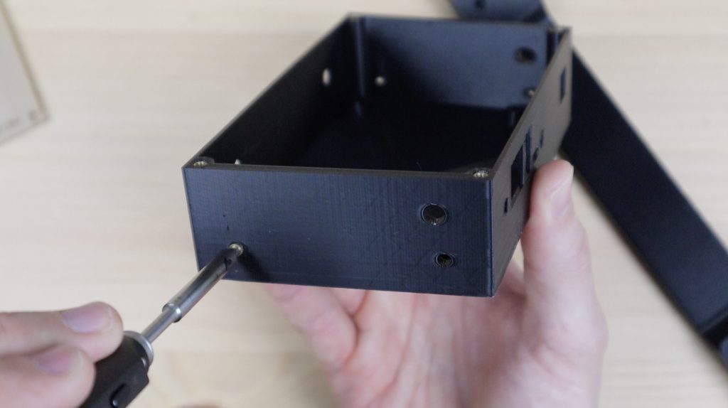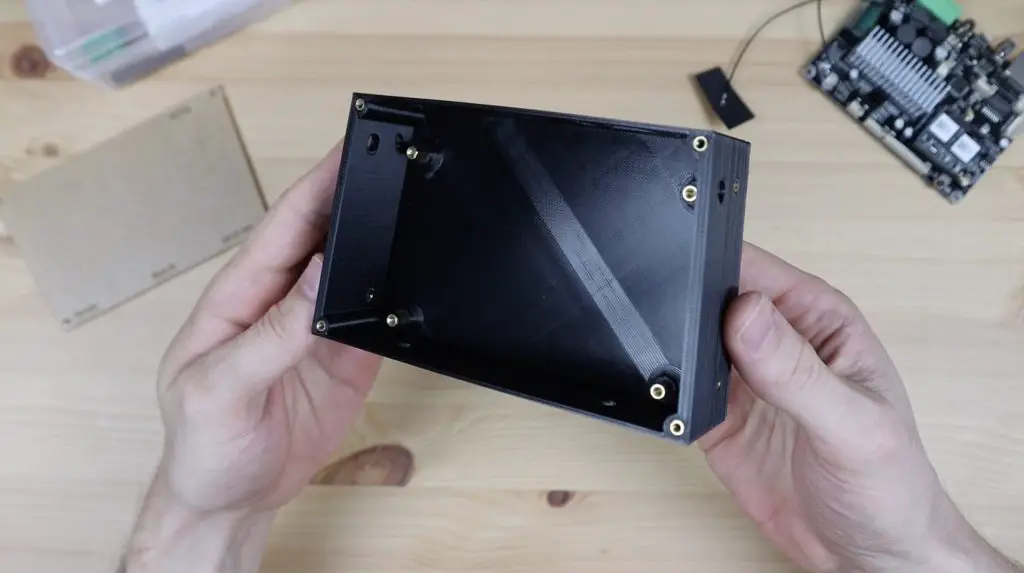 On the Arylic amplifier housing, you’ll need to add four inserts to the top four holes for the acrylic cover and then four inserts into the holes on the sides to mount to the speakers. The handle also needs six brass inserts as with the original design.