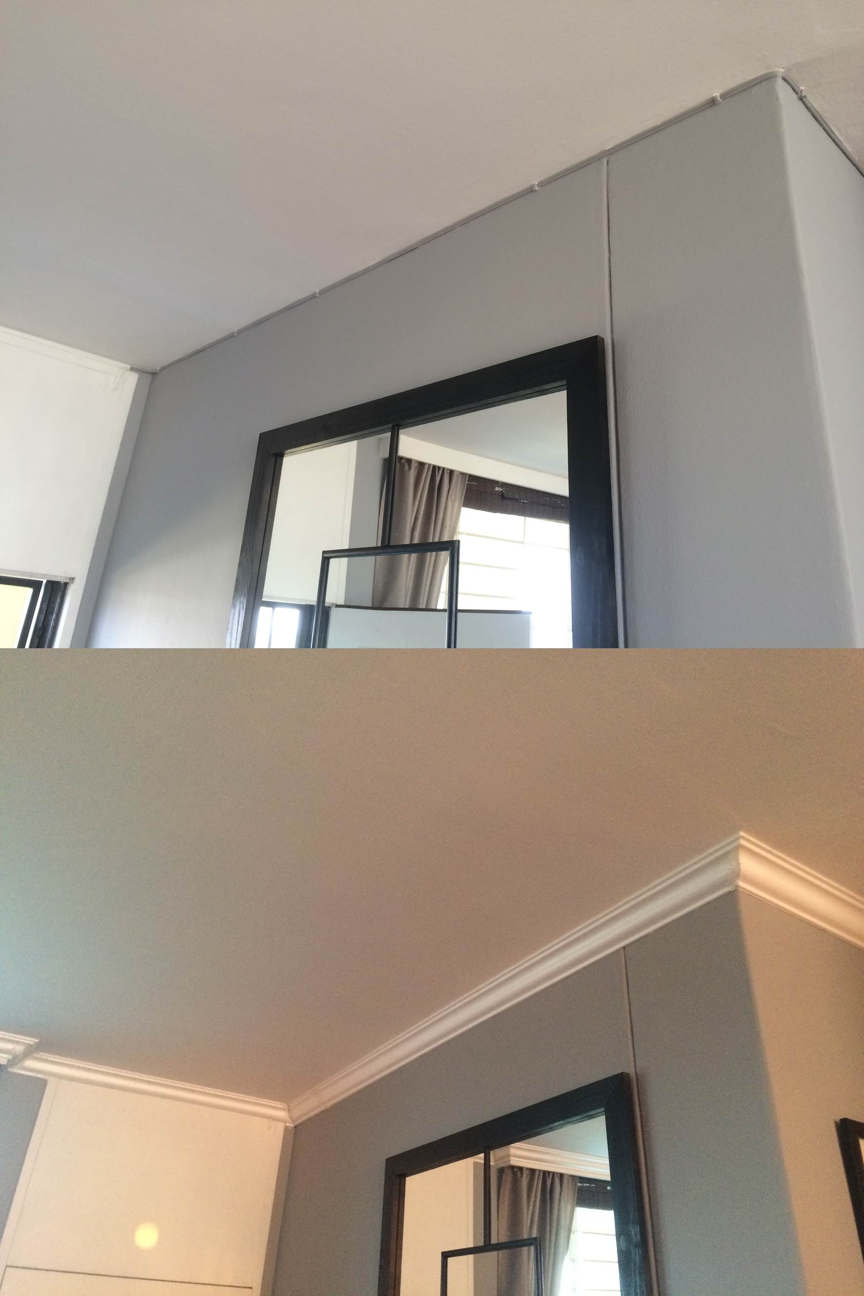 For an inside corner, the top part of the molding will be the shorter side and for an outside corner, the bottom part of the molding will be the shorter side.