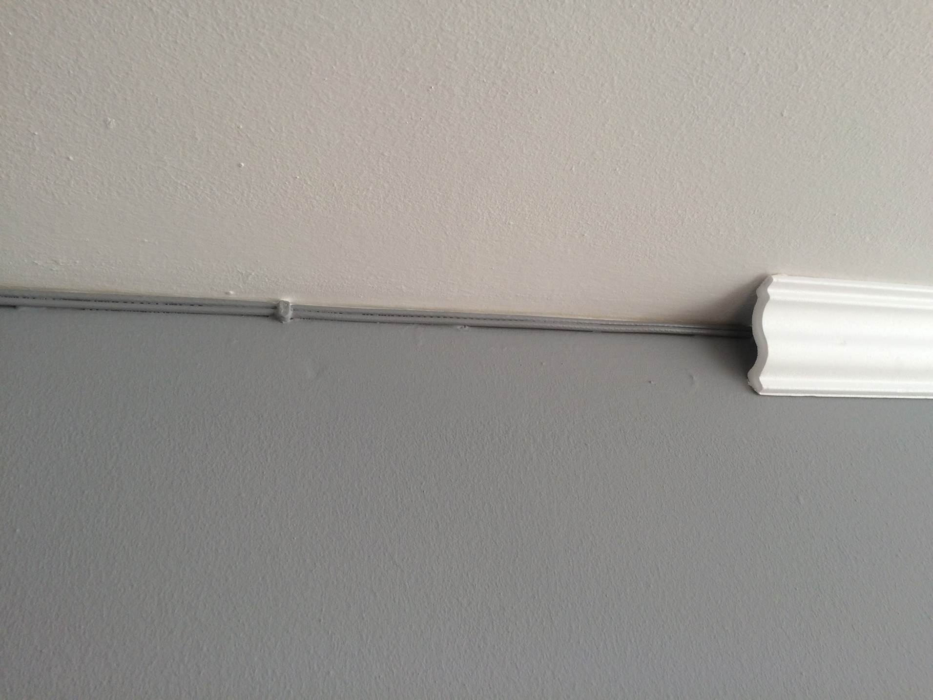 Start in a corner of the longest length of the room so that you get some practice installing the easier straight sections first. Cut the molding to fit the corner as per the instructions below. Now apply a continuous bead of adhesive to the top and bottom flat faces of the inside of the molding. Align the molding to the ceiling and wall joint and gently press it into place starting at the corner end and working your way across. Continue adhering straight sections one against the other until the next corner is reached.