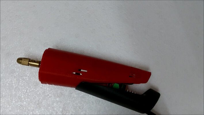 The design was done by Makernaut who used Fusion 360 for the 3D CAD model. The front part has a groove for more control while doing detailed work. It has a snap fit which makes it detachable for changing tool bits. The rest of the casing is made up of 2 parts stuck together using adhesive and holds the motor and pcb with ventilation holes for cooling.