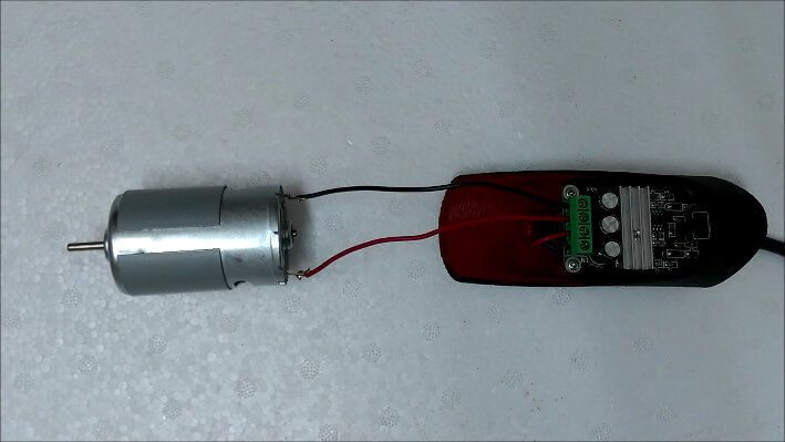 Solder the wires to motor terminals, the other ends go to the ‘Motor +/-’ terminals on the PWM controller circuit board.