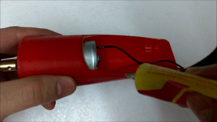 Tuck the motor wires in, and stick the lower casing to the other half casing by applying adhesive at the edges.